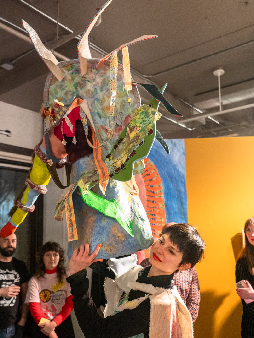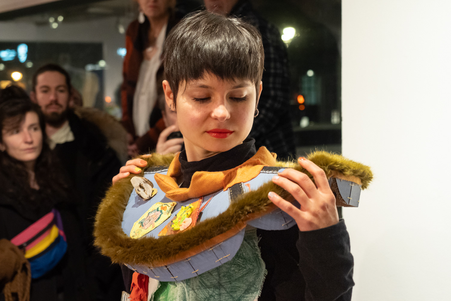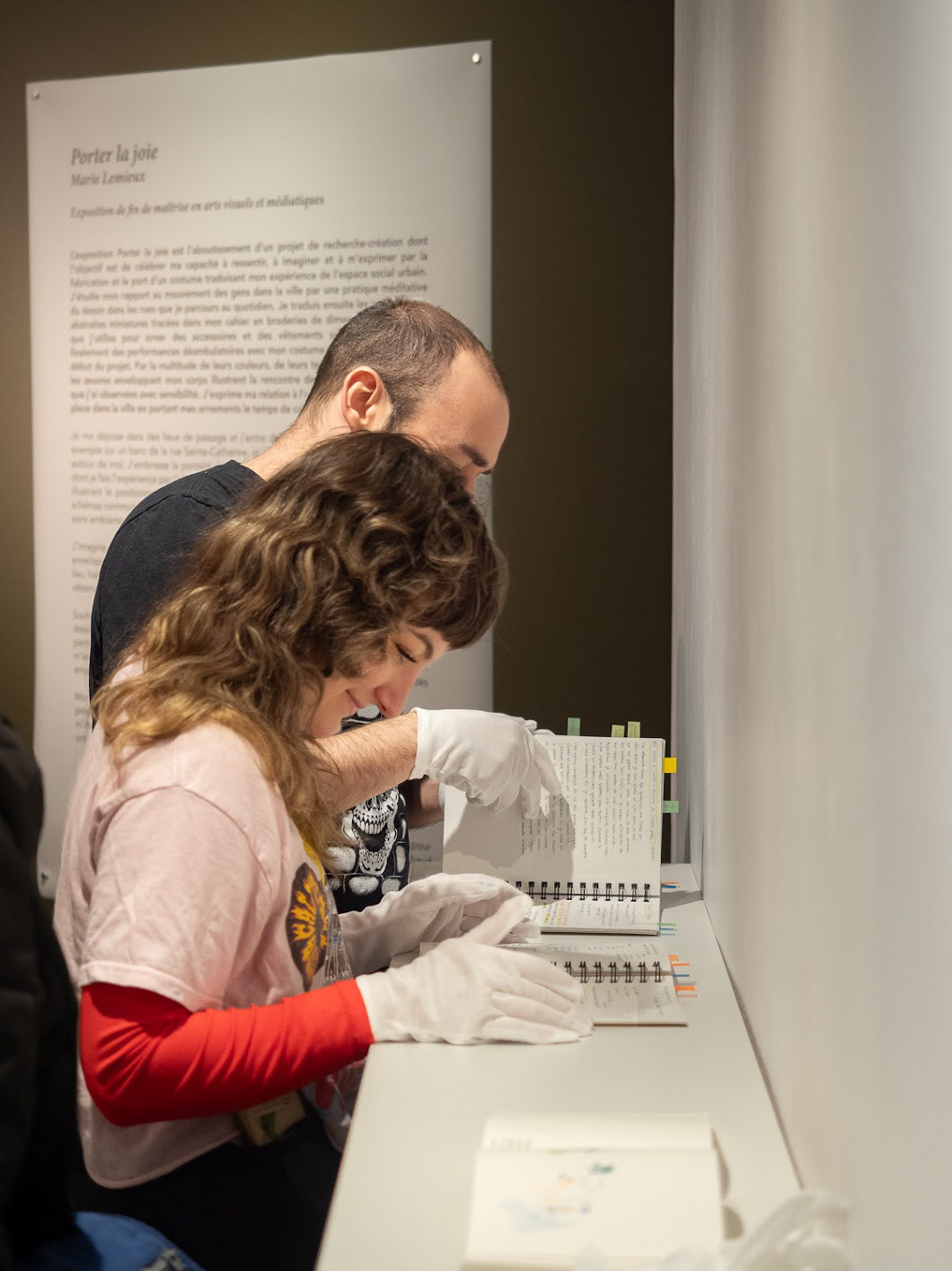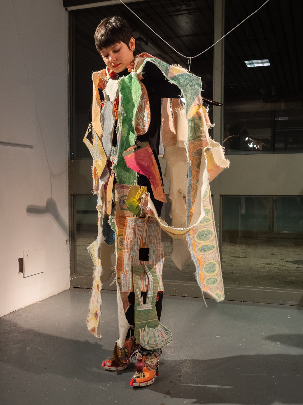 L'exposition Porter la joie est l'aboutissement d'un projet de recherche-création dont l'objectif est de célébrer ma capacité à ressentir, à imaginer et à m’exprimer par la fabrication et le port d’un costume traduisant mon expérience de l’espace social urbain. J’étudie mon rapport au mouvement des gens dans la ville par une pratique méditative du dessin dans les rues que je parcours au quotidien. Je traduis ensuite les compositions abstraites miniatures tracées dans mon cahier en broderies de dimensions semblables, que j’utilise pour orner des accessoires et des vêtements sculpturaux. J’élabore finalement des performances déambulatoires avec mon costume dans les lieux visités au début du projet. Par la multitude de leurs couleurs, de leurs textures et de leurs motifs, les œuvres enveloppant mon corps illustrent la rencontre des trajectoires individuelles que j’ai observées avec sensibilité. J’exprime ma relation à l’univers urbain et j’affirme ma place dans la ville en portant mes ornements le temps de calmes et lentes déambulations.