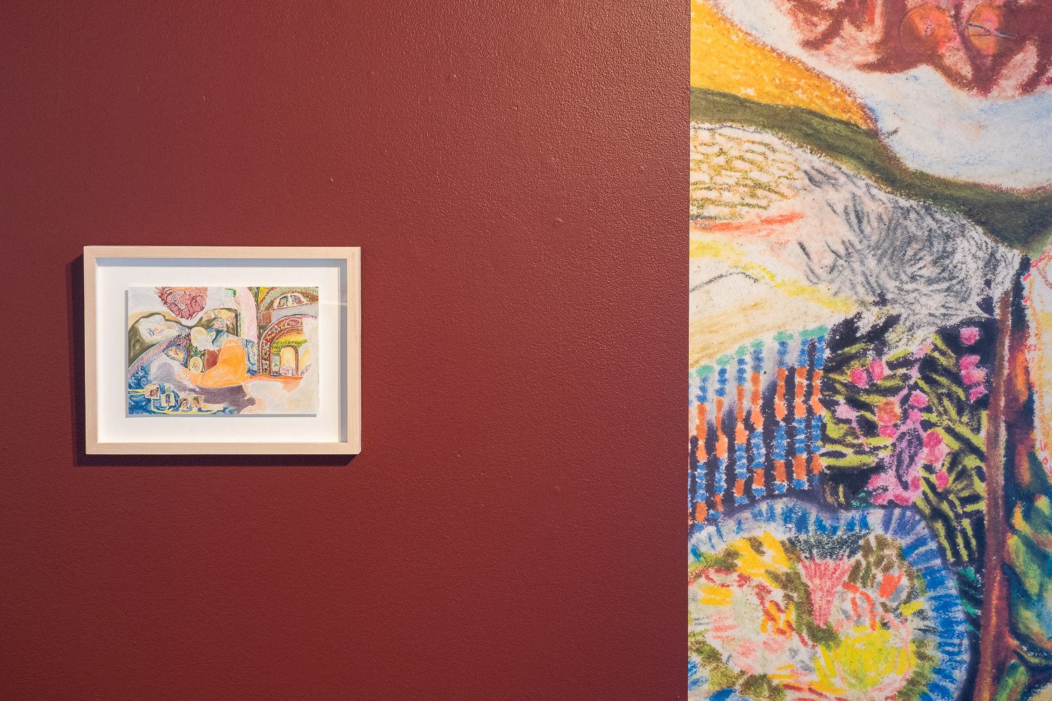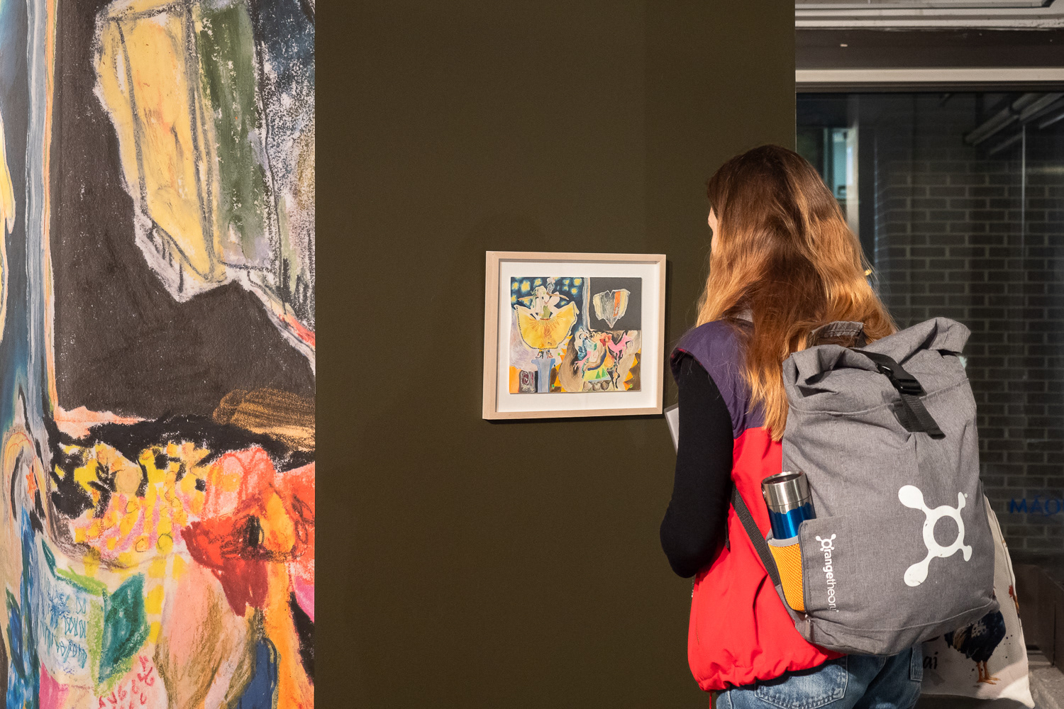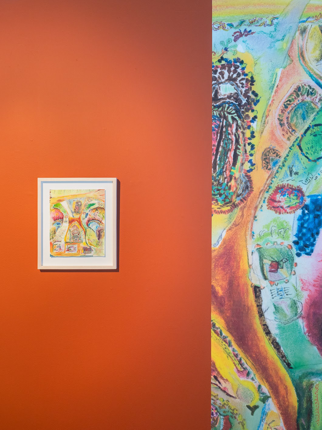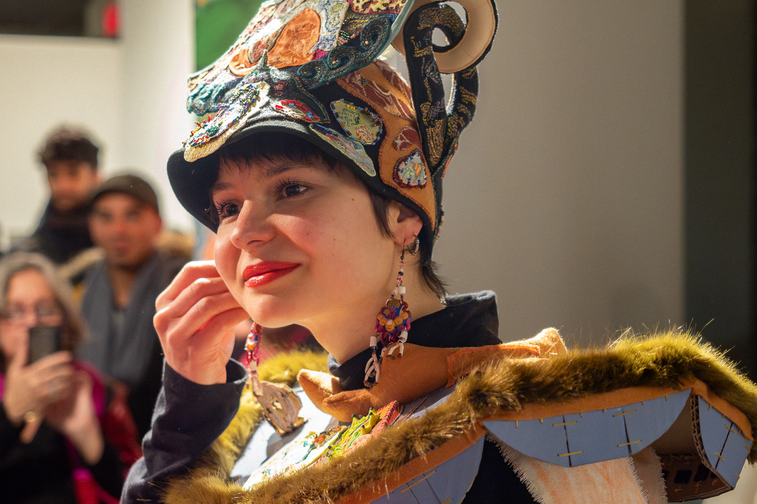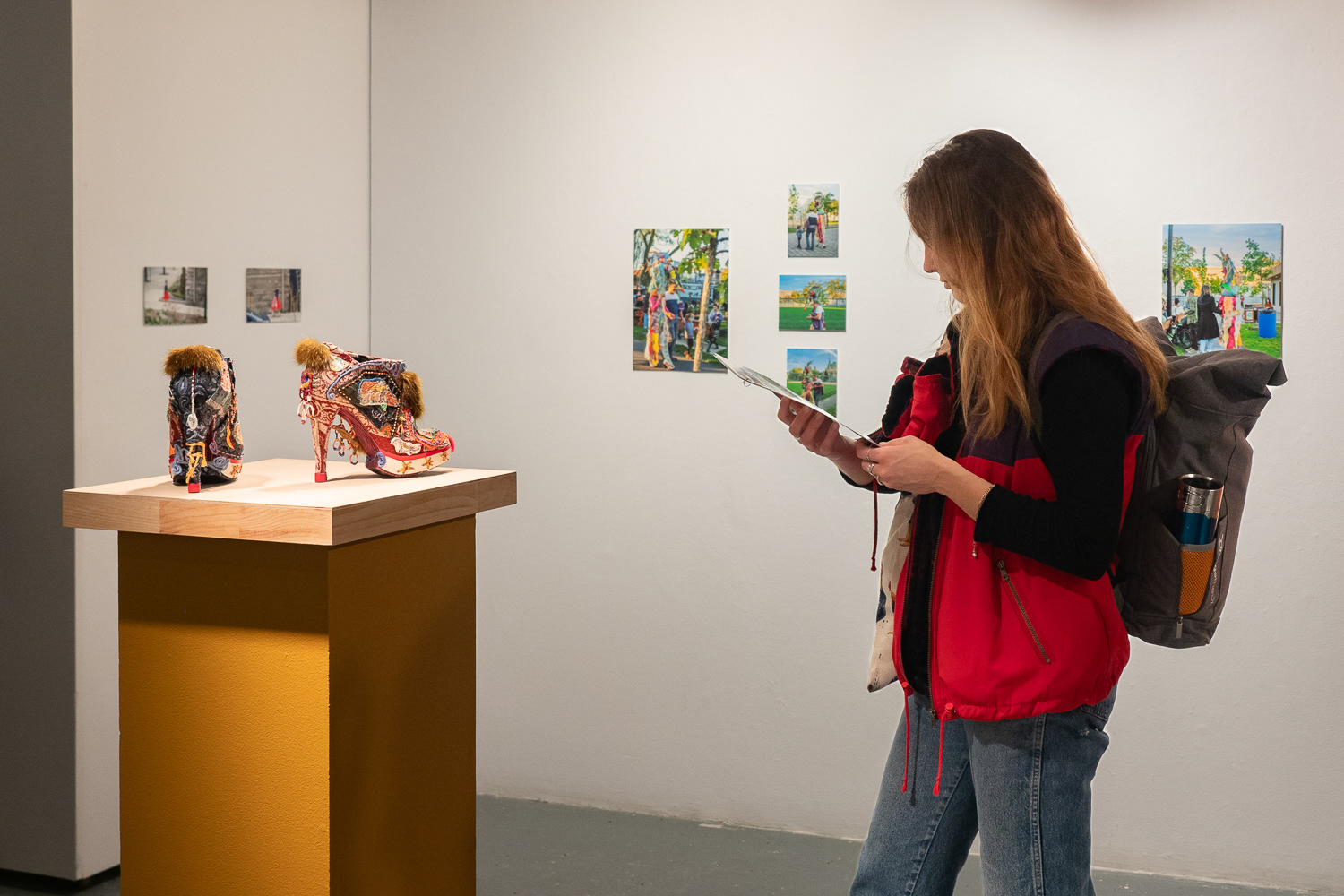 L'exposition Porter la joie est l'aboutissement d'un projet de recherche-création dont l'objectif est de célébrer ma capacité à ressentir, à imaginer et à m’exprimer par la fabrication et le port d’un costume traduisant mon expérience de l’espace social urbain. J’étudie mon rapport au mouvement des gens dans la ville par une pratique méditative du dessin dans les rues que je parcours au quotidien. Je traduis ensuite les compositions abstraites miniatures tracées dans mon cahier en broderies de dimensions semblables, que j’utilise pour orner des accessoires et des vêtements sculpturaux. J’élabore finalement des performances déambulatoires avec mon costume dans les lieux visités au début du projet. Par la multitude de leurs couleurs, de leurs textures et de leurs motifs, les œuvres enveloppant mon corps illustrent la rencontre des trajectoires individuelles que j’ai observées avec sensibilité. J’exprime ma relation à l’univers urbain et j’affirme ma place dans la ville en portant mes ornements le temps de calmes et lentes déambulations.
