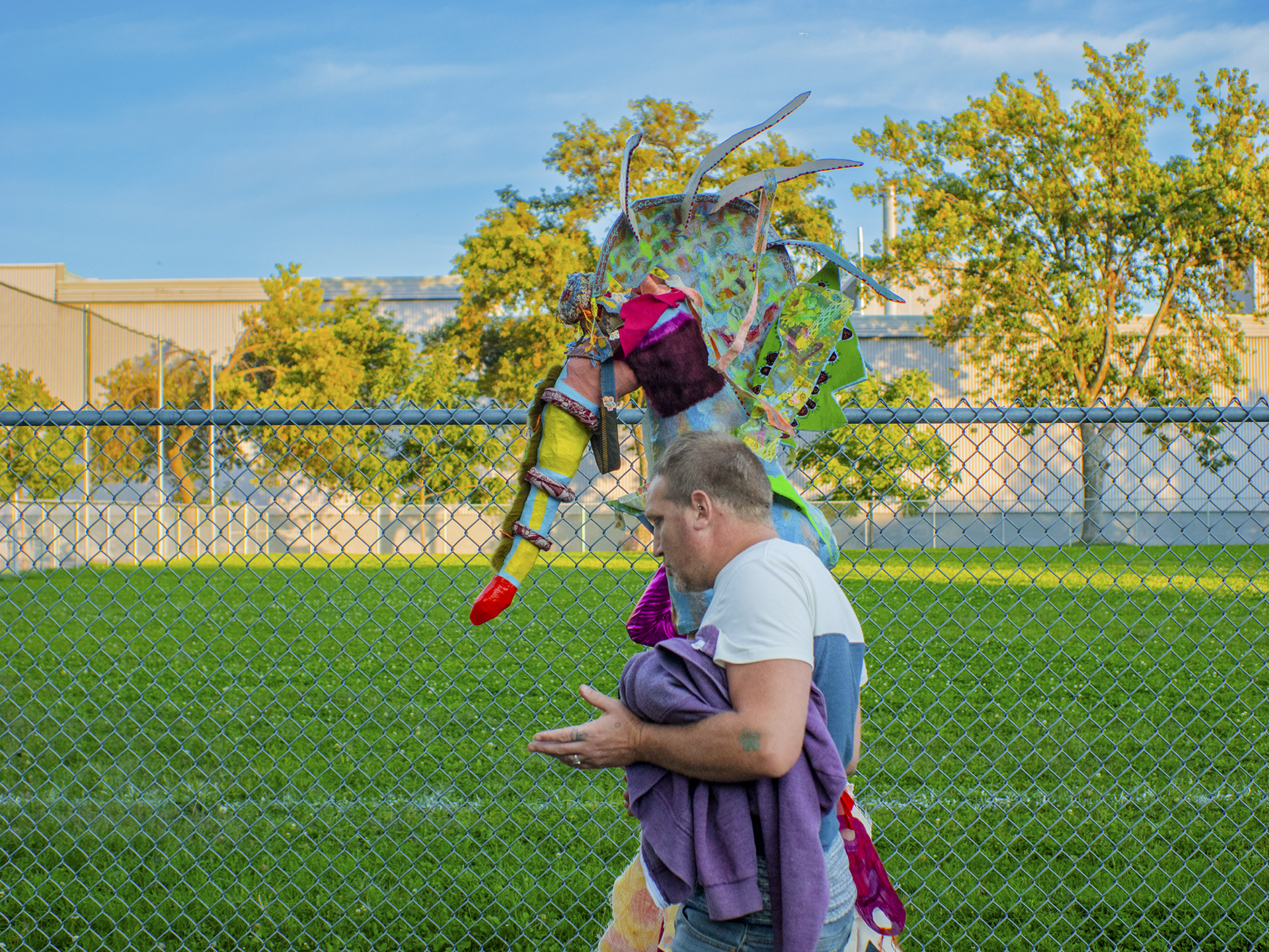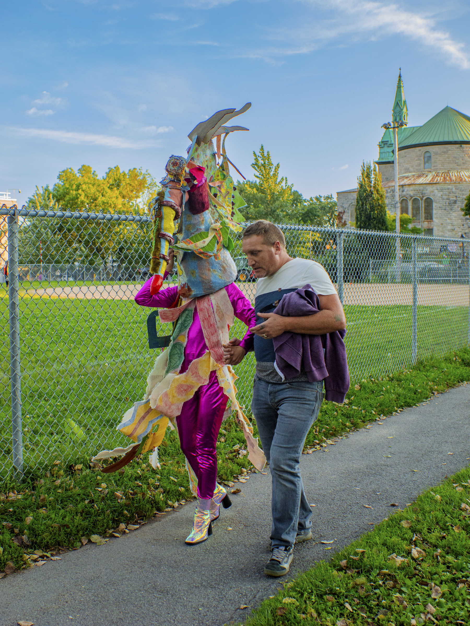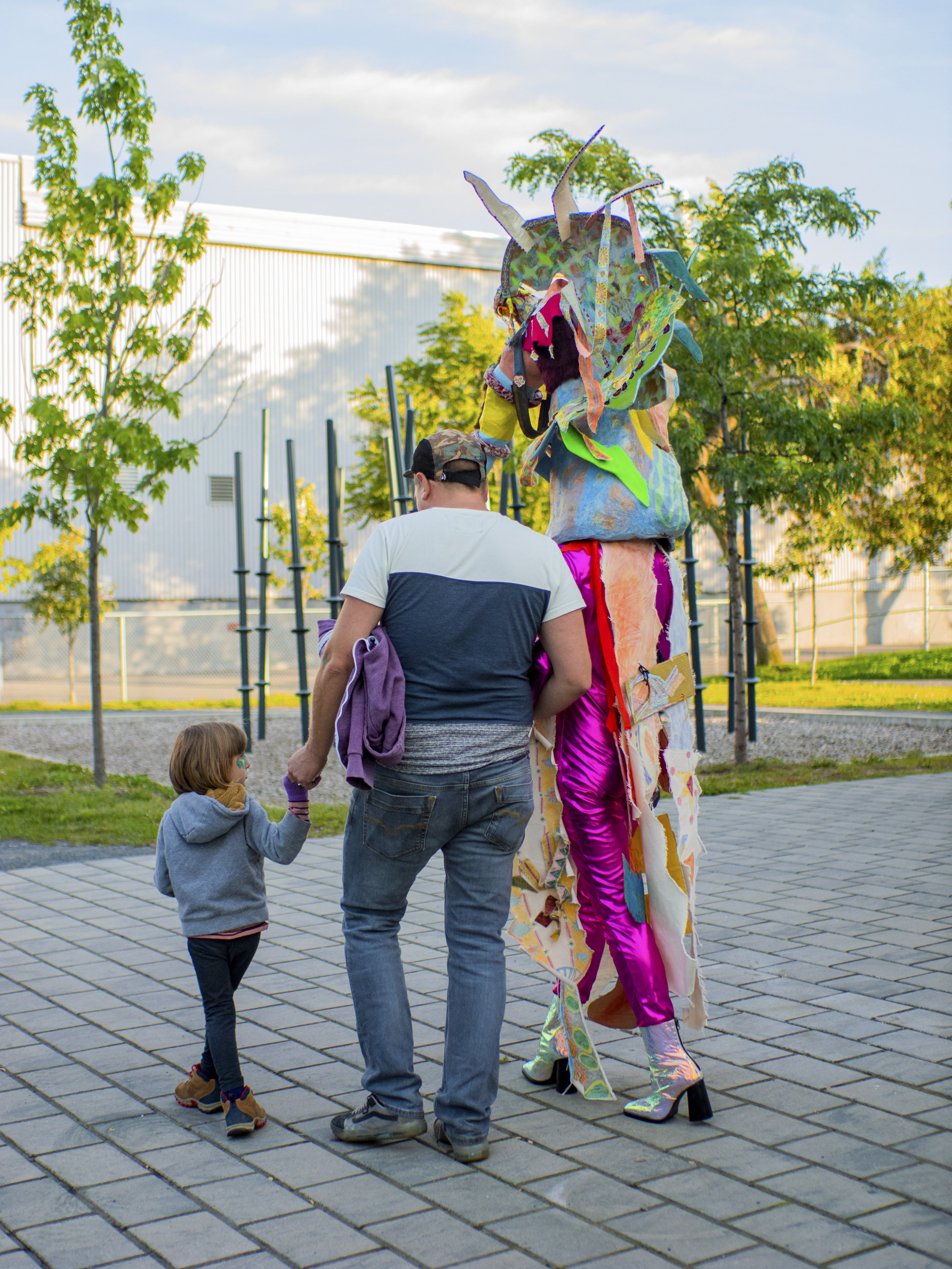 Alors qu’une sculpture aveuglante cachait ma tête, qu’un costume habillait mon corps et que des bottes à talon haut couvraient mes pieds, j’invitais les individus qui le souhaitaient à me prendre la main pour faire une promenade avec moi. Nous allions où la personne qui me tenait en avait envie et nous nous arrêtions au moment qu’elle choisissait. Elle me confiait alors à une autre. J’ai ainsi rencontré des inconnu.e.s avec qui j’ai eu des discussions de toutes sortes. Puisque mon intention était de savourer le moment partagé avec la personne qui venait vers moi, j’acceptais le fait que je ne pouvais pas avancer aussi vite qu’à l’habitude. Les bottes et le costume qui nous ralentissaient ainsi que le masque qui me privait de la vue m’amenaient à être davantage à l’écoute et sensible à l’autre. Une relation de confiance s’établissait peu à peu entre nous.