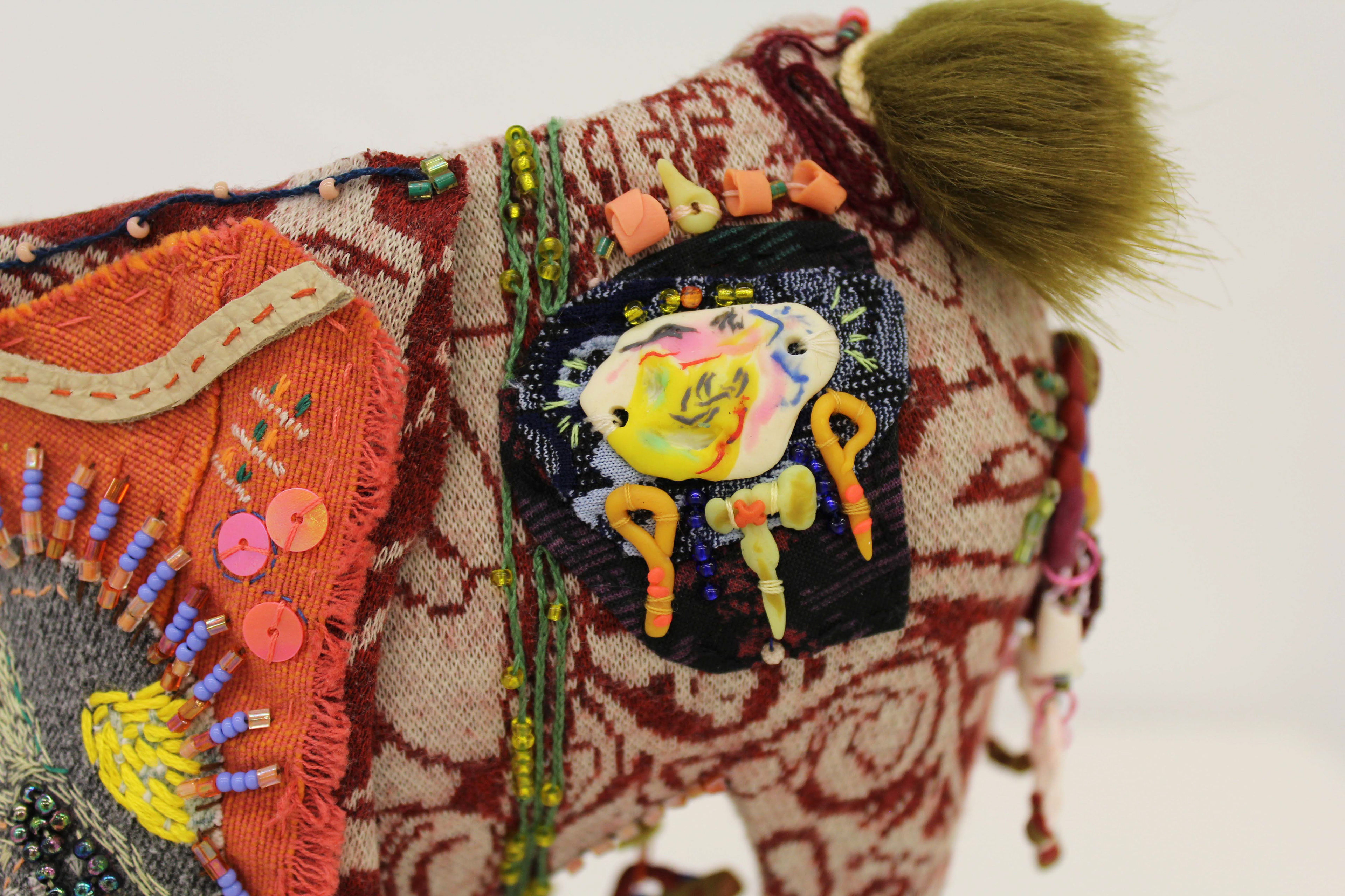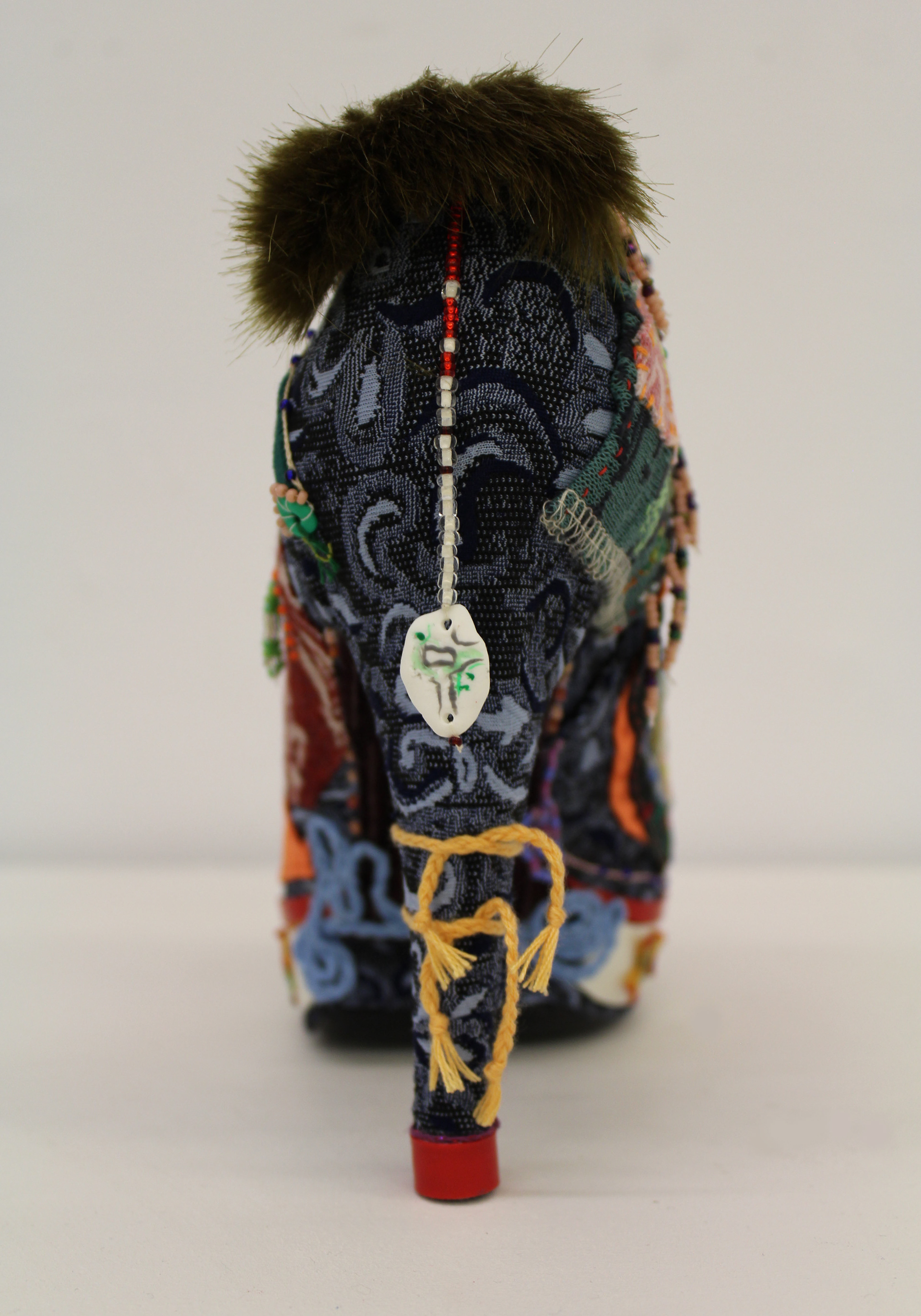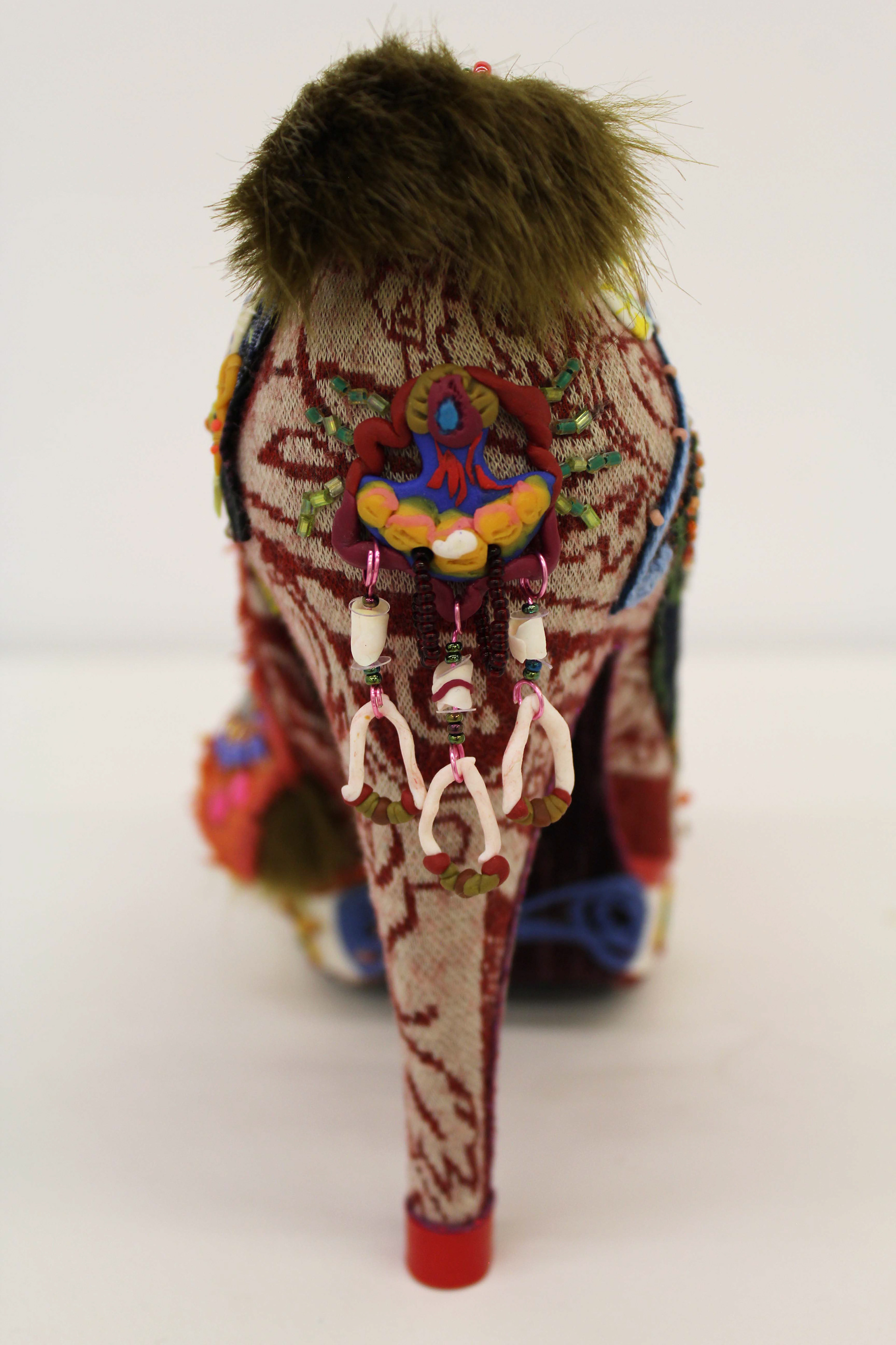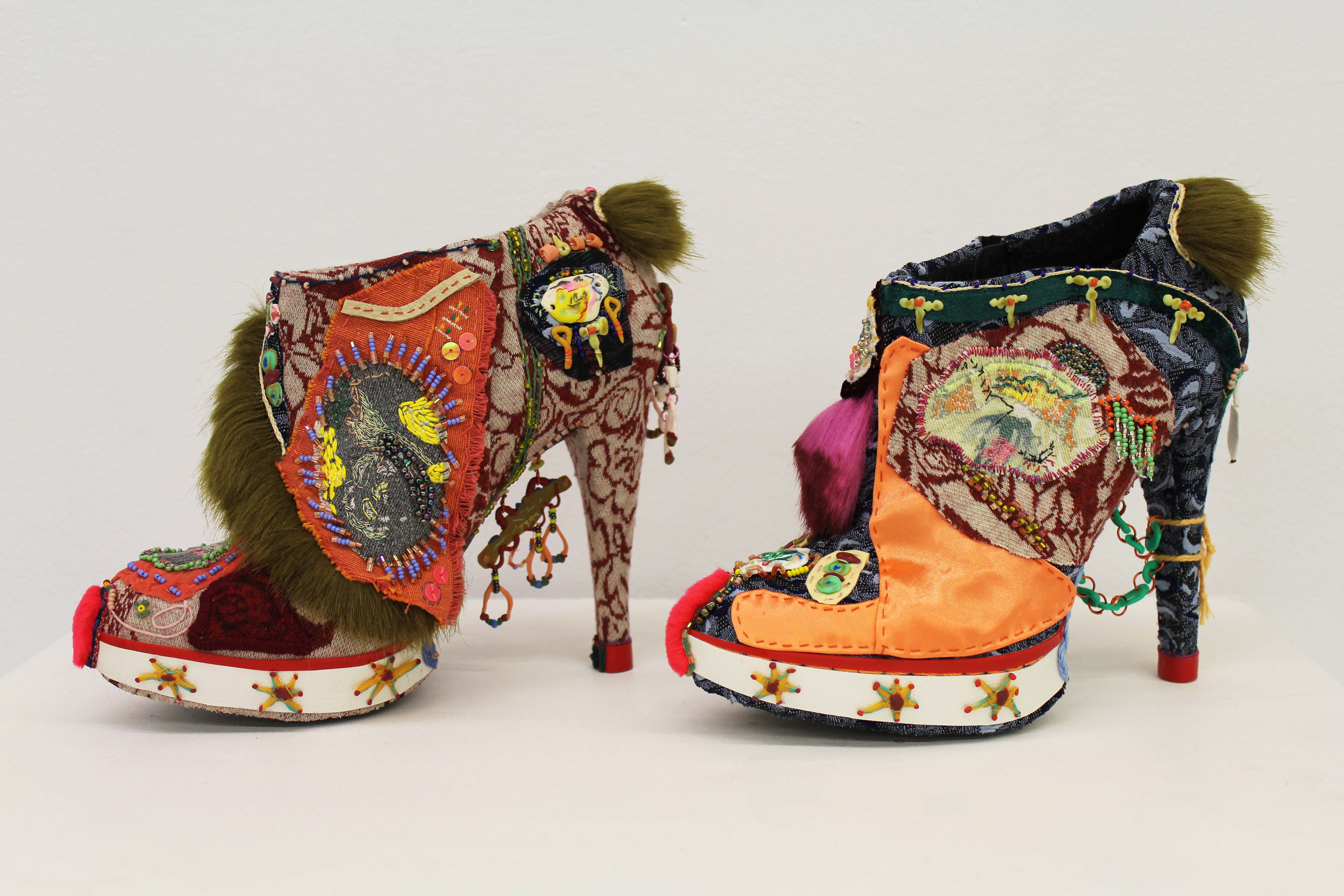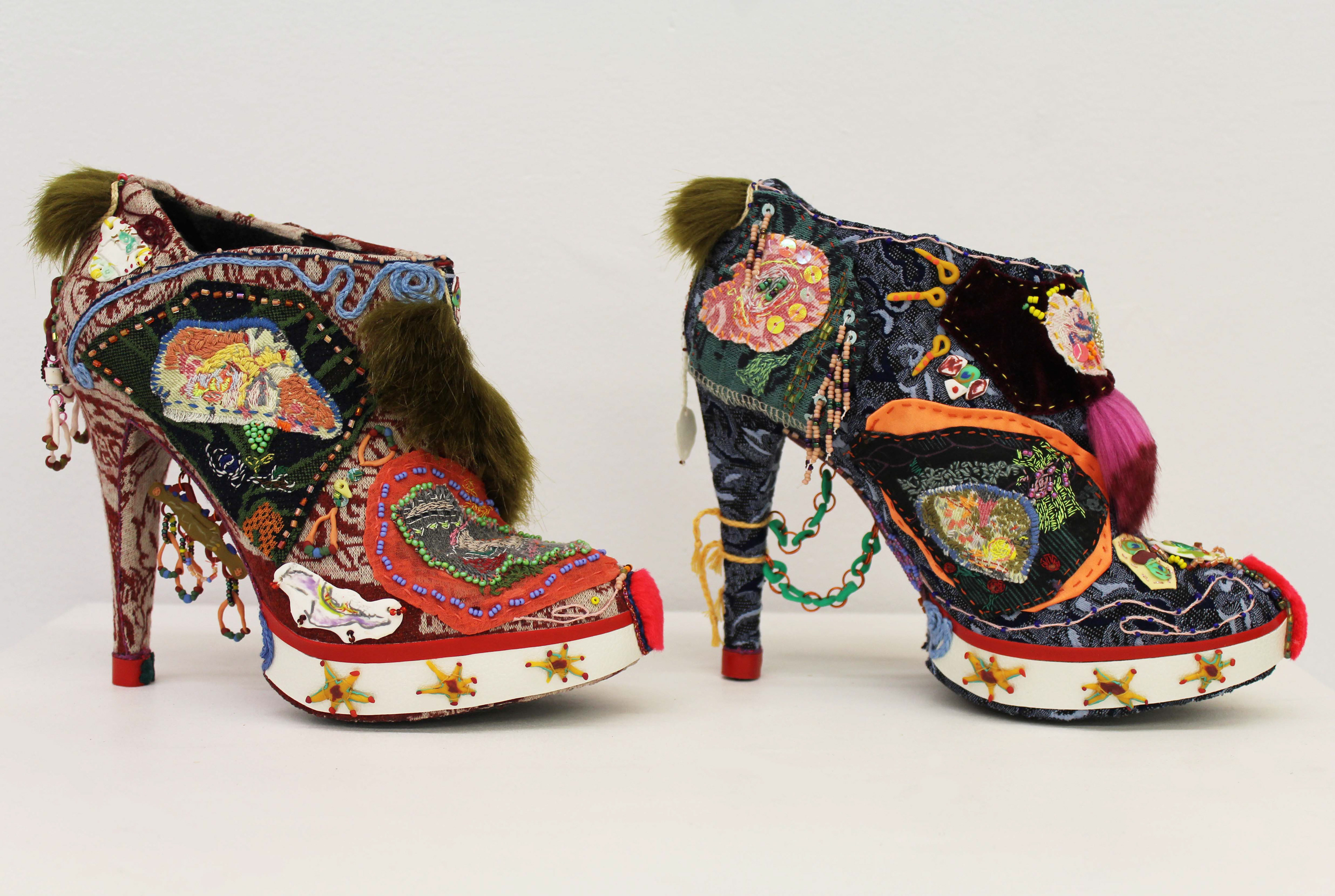 Souliers habillés de promenades montréalaises. Gratitude pour le sol qui supporte nos corps. 2022. Deux souliers de 18,5 cm x 21 cm x 7 cm. Souliers en faux cuir noir recouverts de tissu, fausse fourrure, fil de couture, fil à broder, billes, pièces façonnées en pâte polymère.
